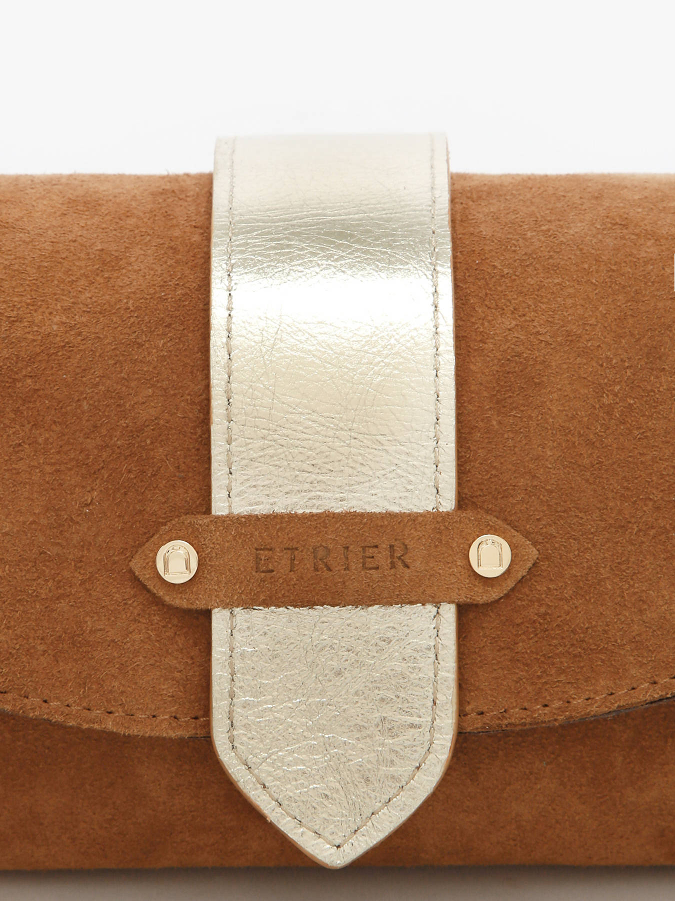 The AGNES crossbody bag by ETRIER is crafted from Italian suede leather, offering a soft and refined texture. This model is shown here in size S and features a flap closure secured with a magnetic snap button. It is also available in size M for those who prefer a roomier option. The bag includes a reversible tab featuring one gold side and one side in matching leather, allowing for easy personalization. It attaches effortlessly with two collar buttons and can be discreetly slipped into the dedicated back pocket when not in use. The interior, fully lined in gold leather, features three compartments, including a central zipped pocket, allowing you to organize your essentials with both practicality and elegance. The structured base ensures optimal support and maintains the bag's shape during daily use. The ETRIER logo, embossed on natural leather and accompanied by a small French flag, serves as a subtle marker of craftsmanship. The leather shoulder strap measures 130 cm upon delivery and can be easily adjusted using the discreet knot inside the bag—simply untie, adjust, and re-tie to achieve your ideal length. This model combines French craftsmanship, premium materials, and refined practicality. For even more personalization, explore our selection of animal-print statement tabs available on our website.