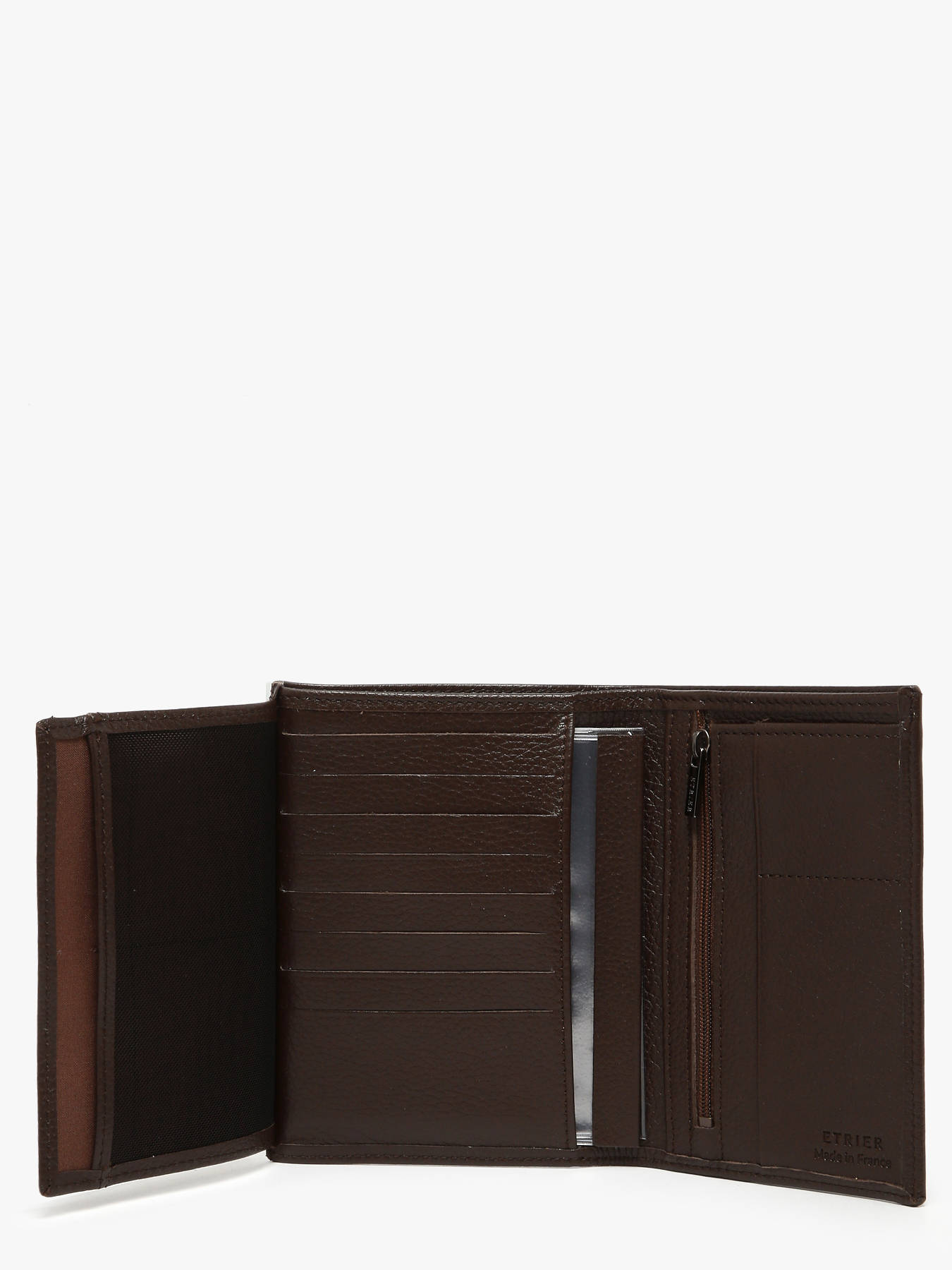 The leather Madras wallet by ETRIER stands out with its practical and elegant design. On the back, a full-length open pocket for bills provides easy storage. When unfolded, the left side features a mesh pocket covering the entire surface. On the back, there are two vertical transparent plastic card slots and a large vertical slot that spans the full height. A sewn French flag at the bottom left adds authenticity. The middle section includes eight horizontal card slots, accompanied by a large vertical opening with a plastic holder for a 9x13 cm permit inside. The right side features a large vertical opening, a full-height zippered pocket, and two vertical open pockets. At the bottom right, the metal ETRIER logo and the Made in France inscription, embossed in tone-on-tone, add a touch of refinement. This wallet, designed and made in France, embodies artisanal craftsmanship and the authenticity of the product.