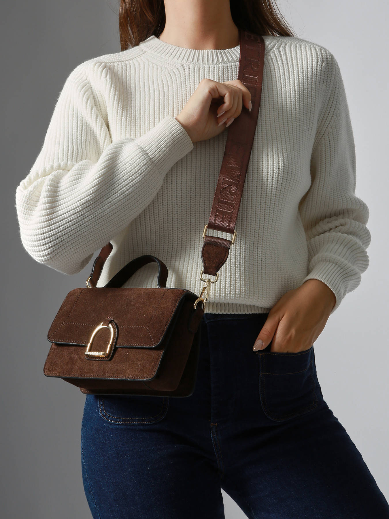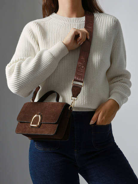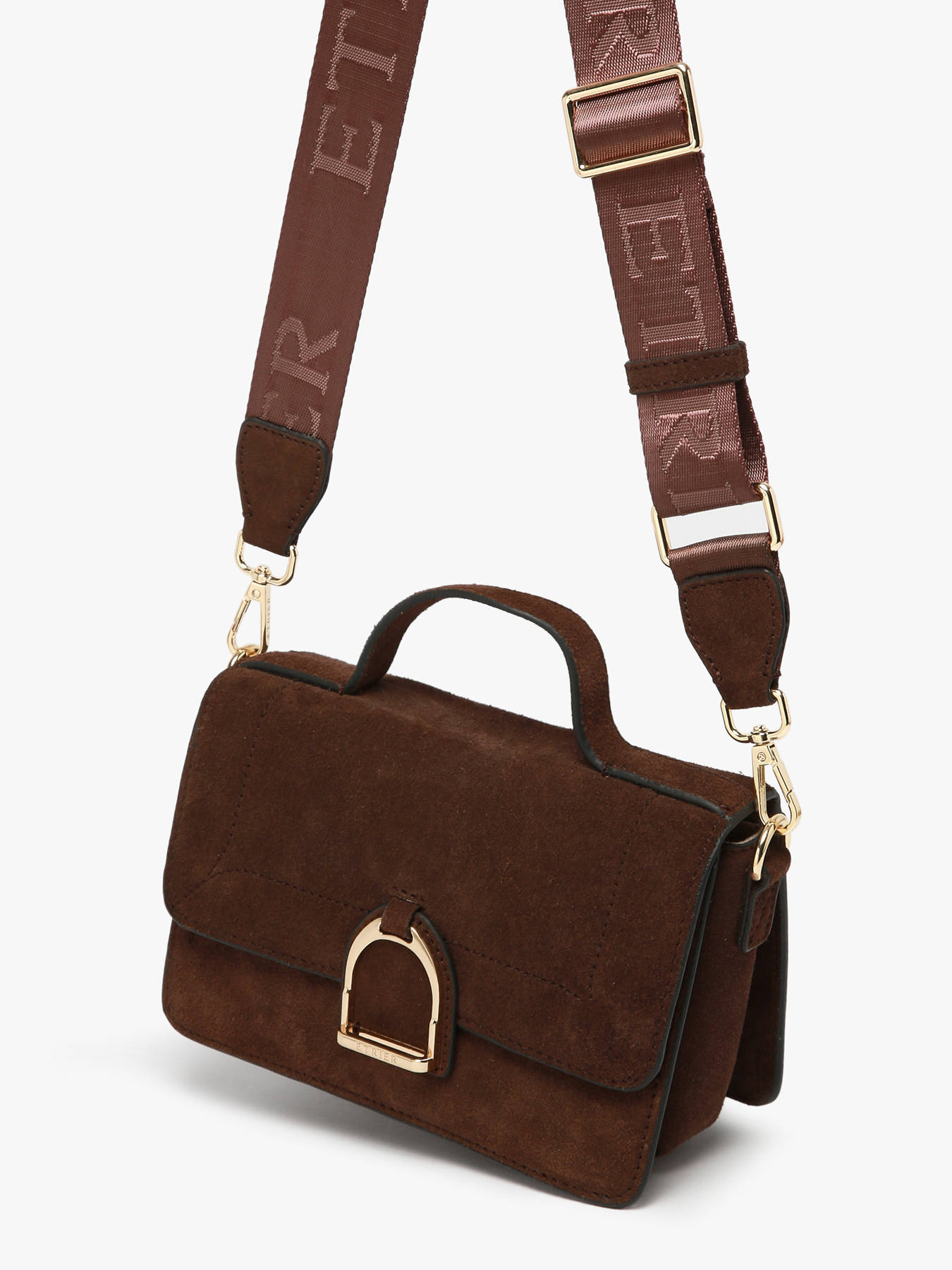 The ETRIER crossbody bag from the ALTESSE SUEDE line is offered in its medium size, the S model. This new winter edition of our iconic line features soft, warm velvety leather, combining timeless elegance with a ""Highlander Cowboy"" spirit. The back of the bag is made of grained leather for enhanced durability. Equipped with a back pocket and a magnetic flap accented by the gold-tone Etrier emblem, it can be carried by hand using its small handle or worn on the shoulder with its adjustable, removable strap.