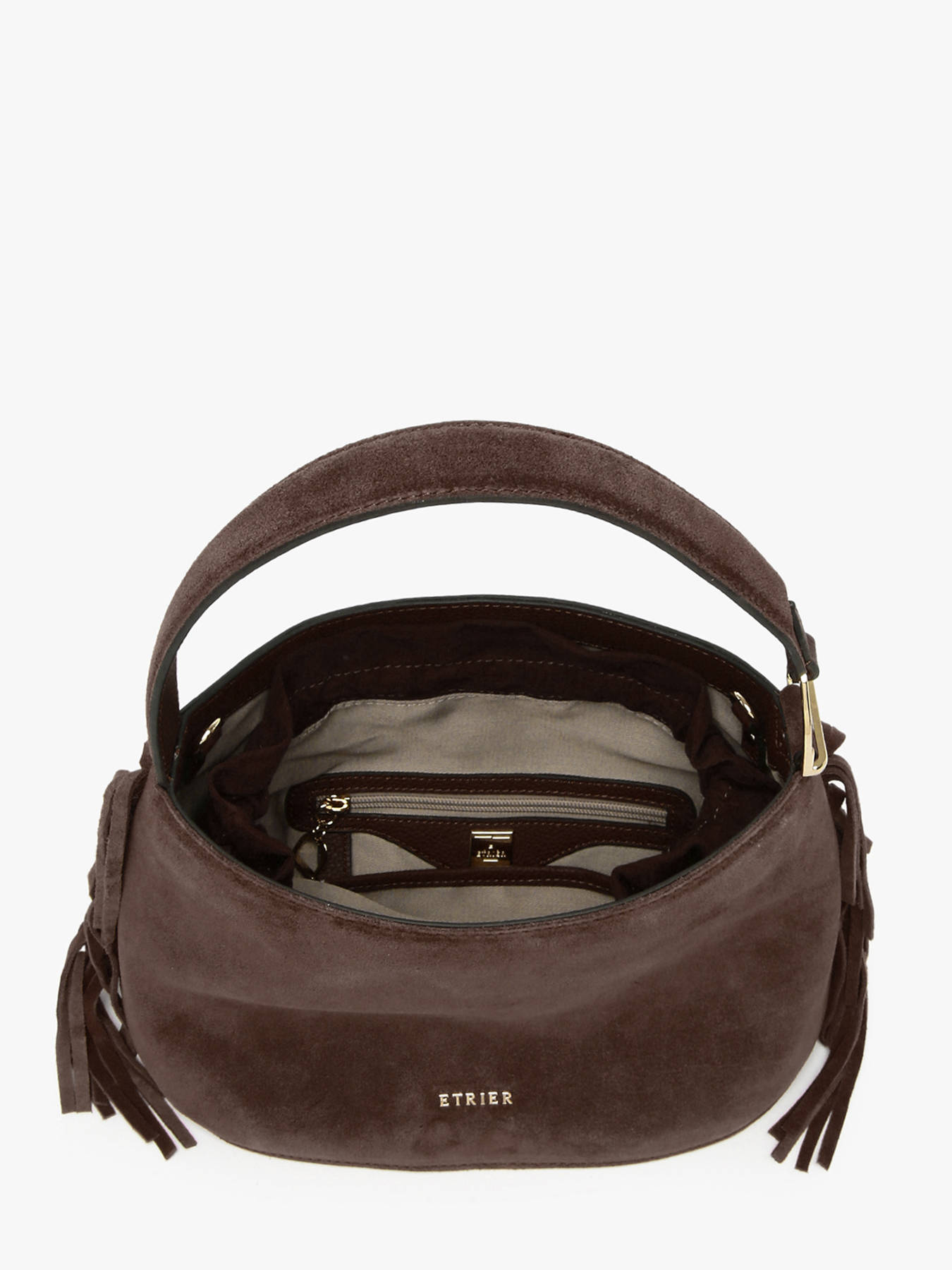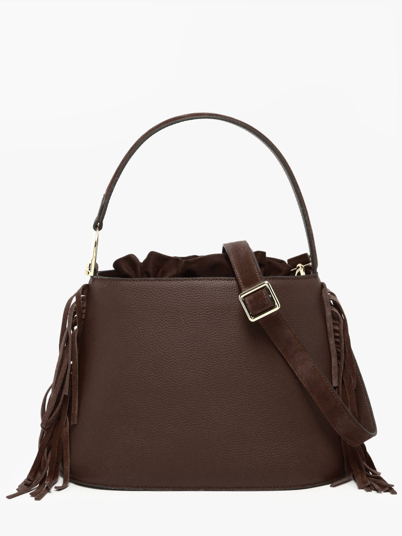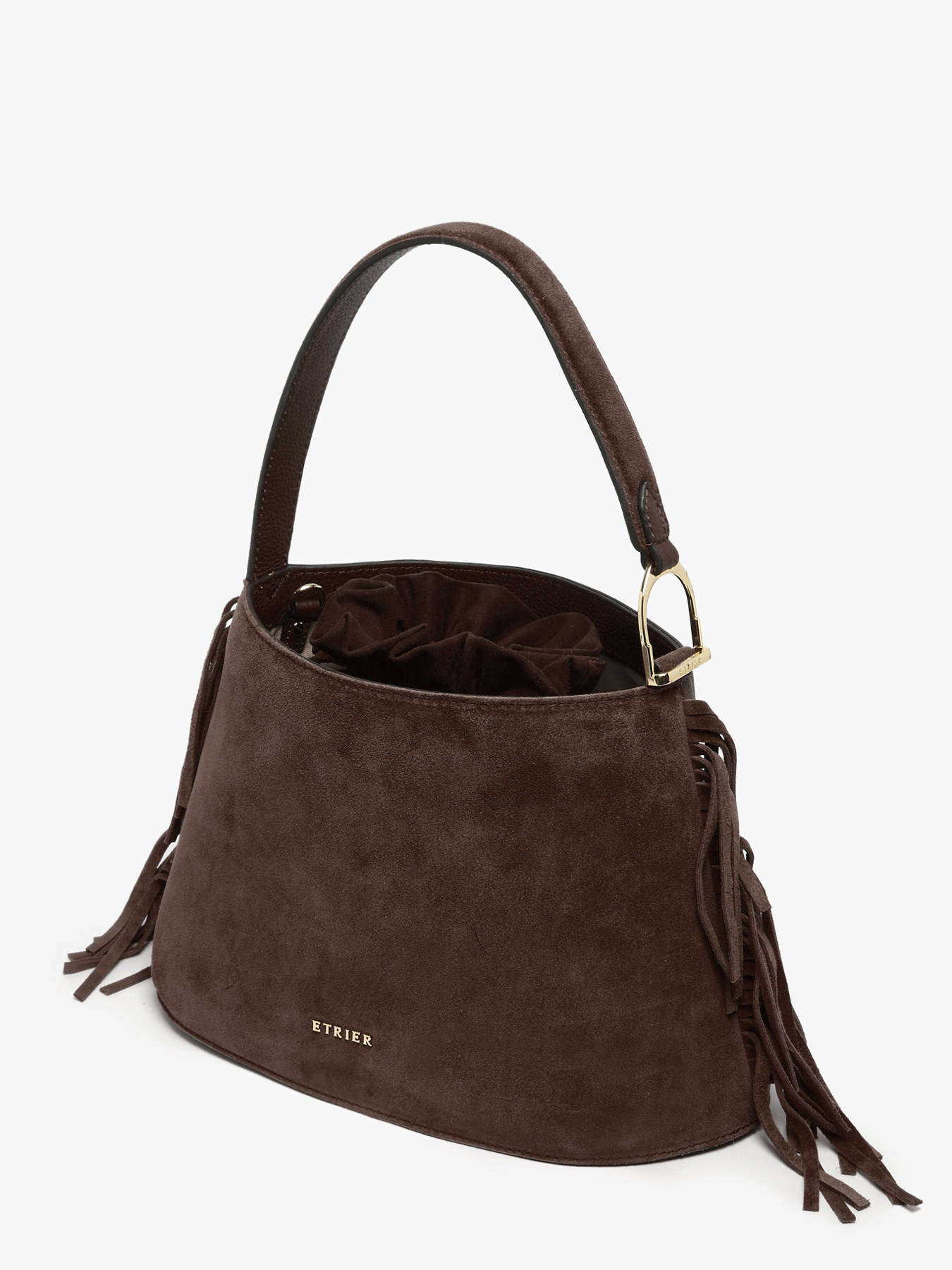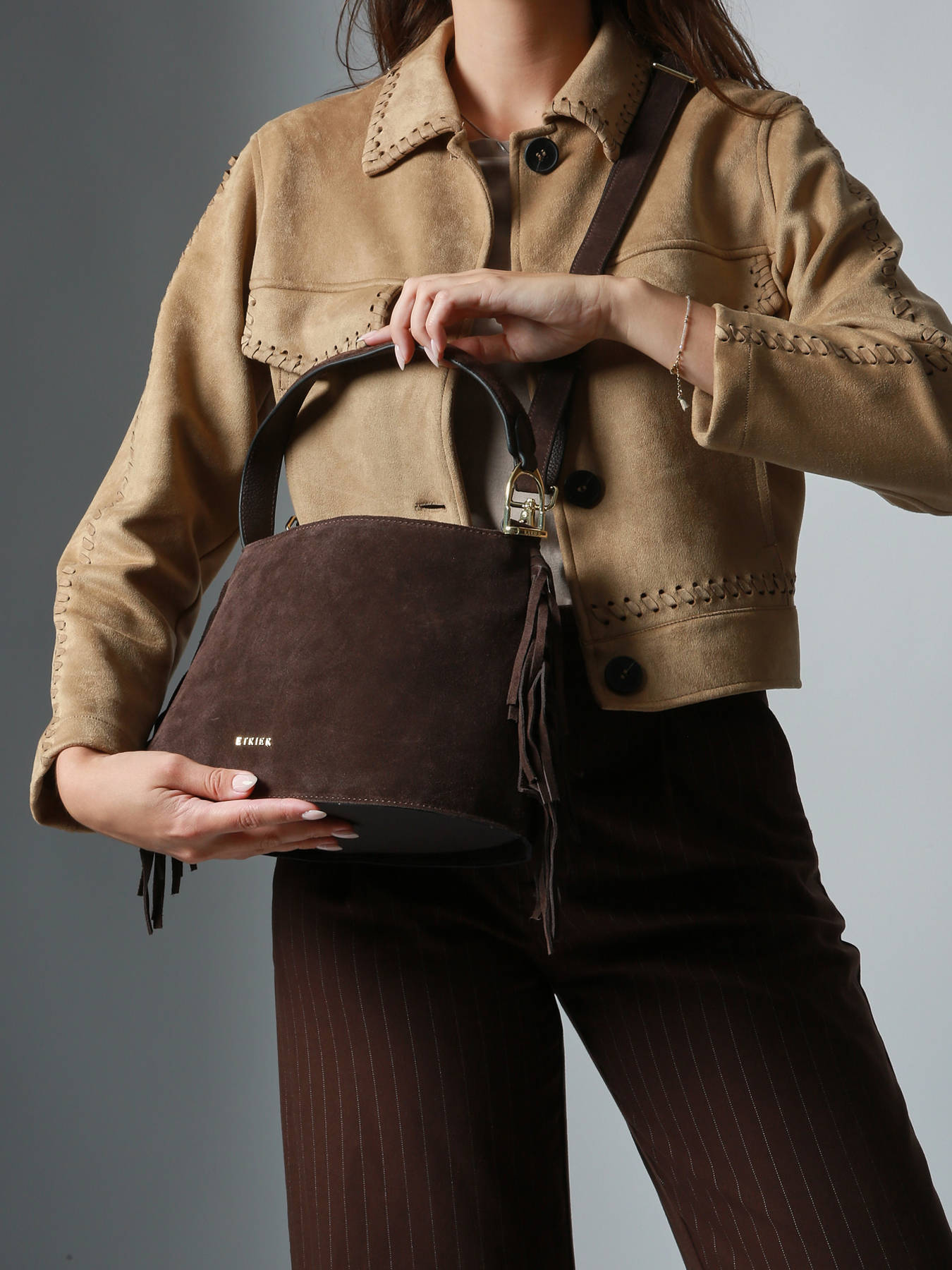 Le sac bandoulière ETRIER de la ligne COUNTRY est un sac seau en cuir velours à la forme trapèze originale. Il se ferme grâce à un pochon en tissu doté d’un cordon. Ce pochon est fixé au fond du sac par une pression pour plus de maintien. Il se porte à la main grâce à sa poignée ou en travers du corps grâce à sa bandoulière. Les franges ornant les côtés apportent une touche de mouvement et de liberté à ce modèle. Le dos du sac, réalisé en cuir lisse, offre une meilleure tenue. Un bijou en forme d’étrier vient sublimer le côté de la anse, ajoutant une signature raffinée à l’ensemble. COUNTRY capture l’essence d’un style libre et élégant, mêlant textures authentiques et dynamique naturelle, pour une allure parfaite en hiver.