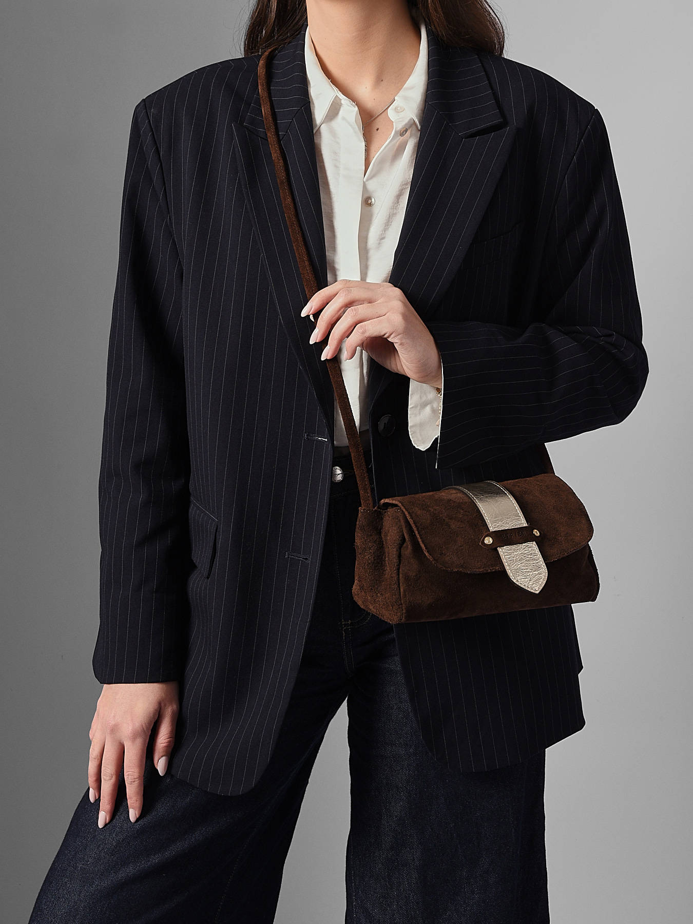 The AGNES crossbody bag by ETRIER is crafted from Italian suede leather, offering a soft and refined texture. This model is shown here in size S and features a flap closure secured with a magnetic snap button. It is also available in size M for those who prefer a roomier option. The bag includes a reversible tab featuring one gold side and one side in matching leather, allowing for easy personalization. It attaches effortlessly with two collar buttons and can be discreetly slipped into the dedicated back pocket when not in use. The interior, fully lined in gold leather, features three compartments, including a central zipped pocket, allowing you to organize your essentials with both practicality and elegance. The structured base ensures optimal support and maintains the bag's shape during daily use. The ETRIER logo, embossed on natural leather and accompanied by a small French flag, serves as a subtle marker of craftsmanship. The leather shoulder strap measures 130 cm upon delivery and can be easily adjusted using the discreet knot inside the bag—simply untie, adjust, and re-tie to achieve your ideal length. This model combines French craftsmanship, premium materials, and refined practicality. For even more personalization, explore our selection of animal-print statement tabs available on our website.